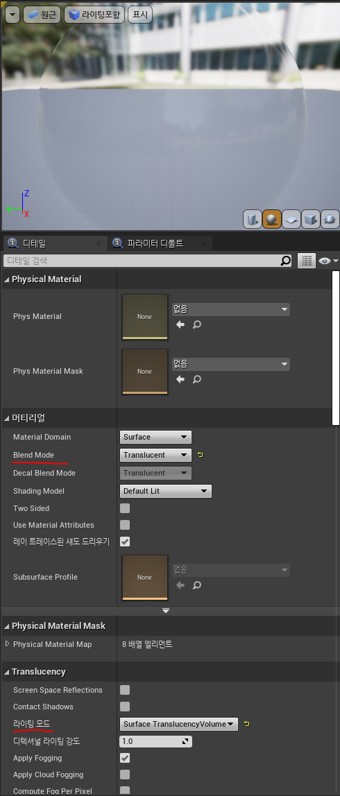 - 머티리얼을 생성하고 디테일 창에서 Blend Mode를 'Translucent'로, 라이팅 모드를 'Surface Translucency Volume'로 세팅합니다.