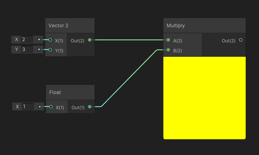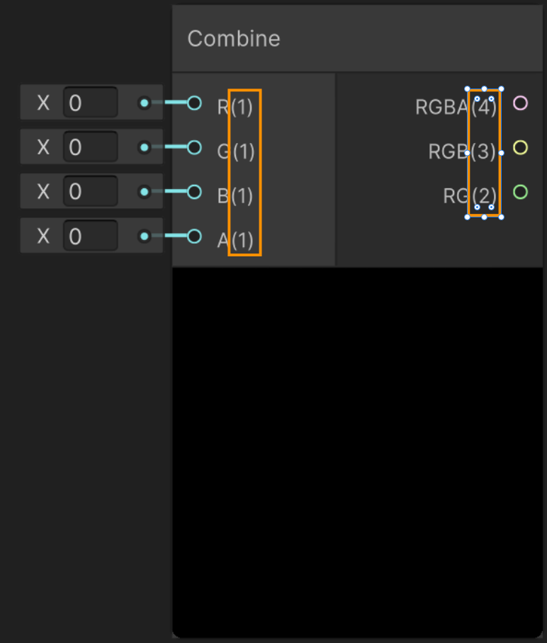 각 노드의 Input과 Output 옆에 숫자로 몇 행의 데이터가 들어가고 나오는지 표시됩니다. 슬롯과 연결선에서 파란색은 Float, 녹색은 Vector 2, 노란색은 Vector 3, 빨간색은 Vector 4 데이터를 의미합니다.