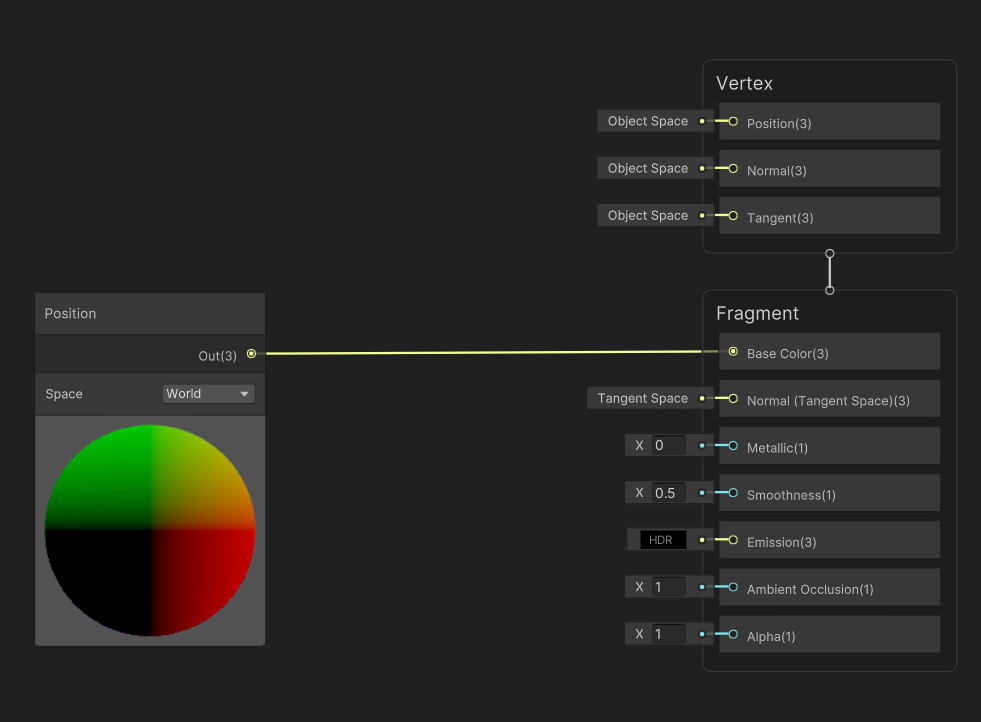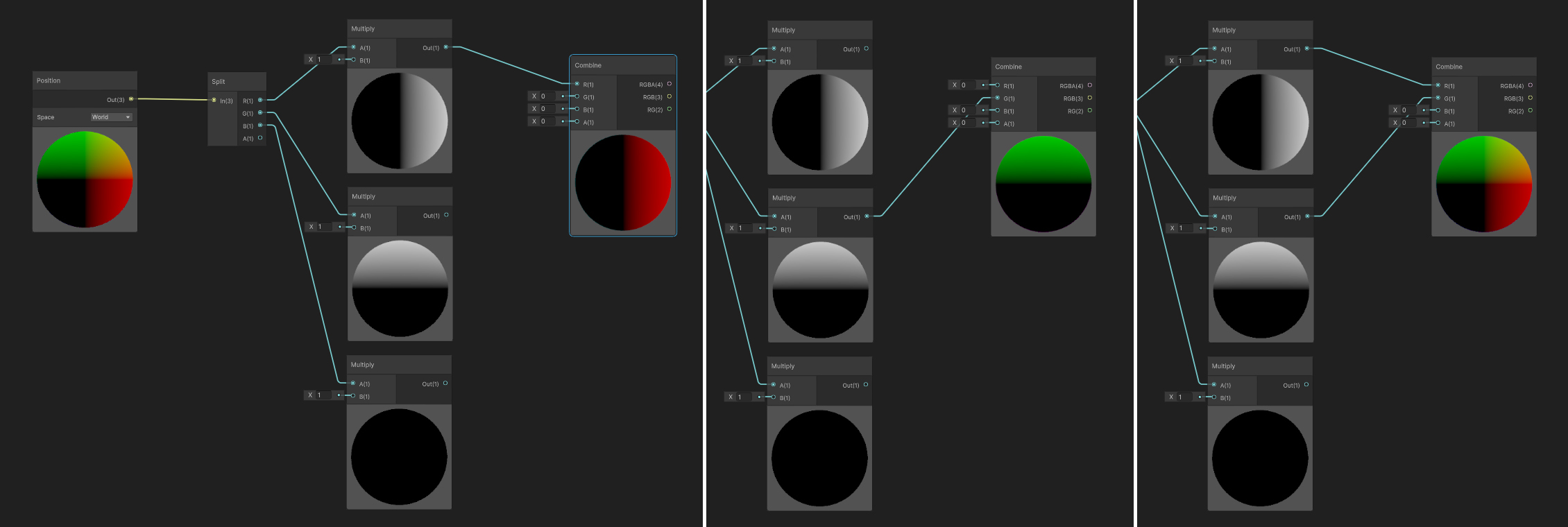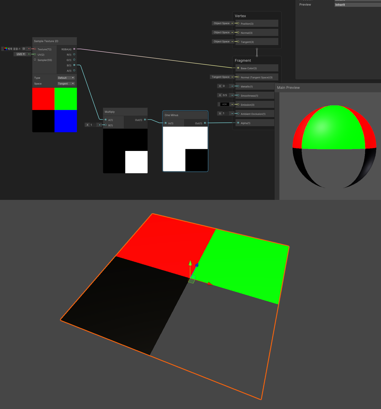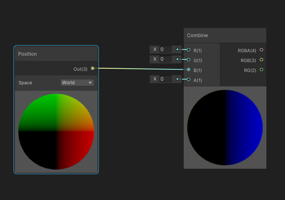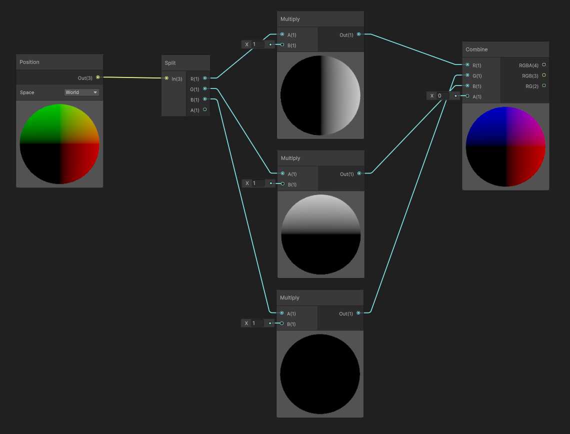이렇게 데이터와 노드의 기능들을 이해하게 되면 적은 노력으로 많은 것을 할 수 있습니다. 예를 들어 위에서 Position의 Out을 Split으로 분리한 다음 G, B 채널을 바꿔서 Combine으로 결합하면, 기존의 Position 프리뷰와 다른 결괏값을 갖게 됩니다. Position의 2열과 3열의 위치를 바꿨으니((x, y, z) -> (x, z, y)), 이제 이 쉐이더 그래프에서 Combine 데이터를 World Position으로 사용하면 Y축과 Z축의 방향이 바뀌게 됩니다.