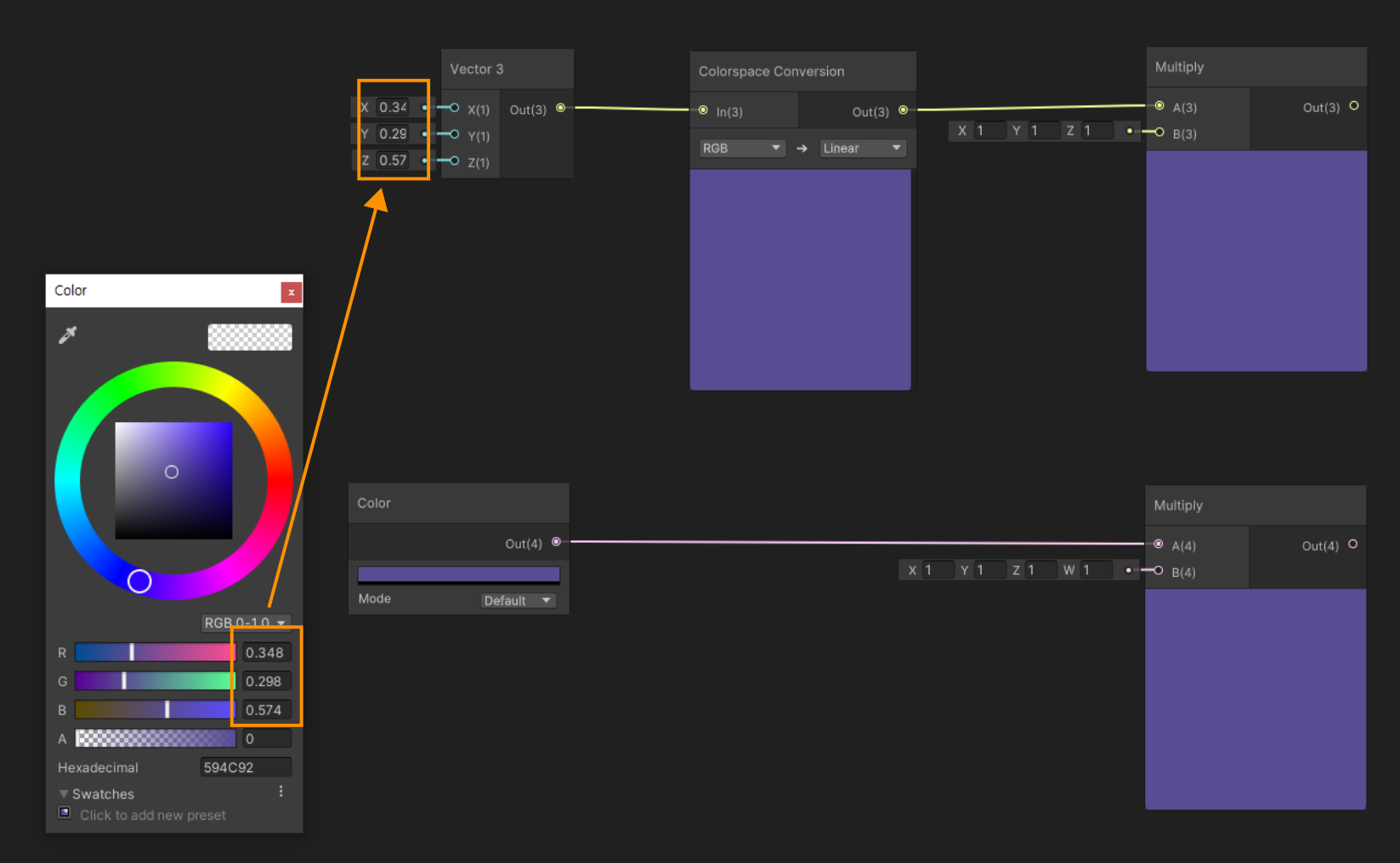 실제로 열의 개수가 다른 행렬 데이터는 서로 사칙연산할 수 없지만 Shader graph에서는 데이터를 연결하면 열의 개수를 알아서 변환해 주기 때문에 편리합니다. 3열의 데이터 Output을 1열 데이터 자리에 연결하면 선의 색이 변하면서, Output의 첫 번째 열만 입력합니다. ex)(3,2,1) -> (3)