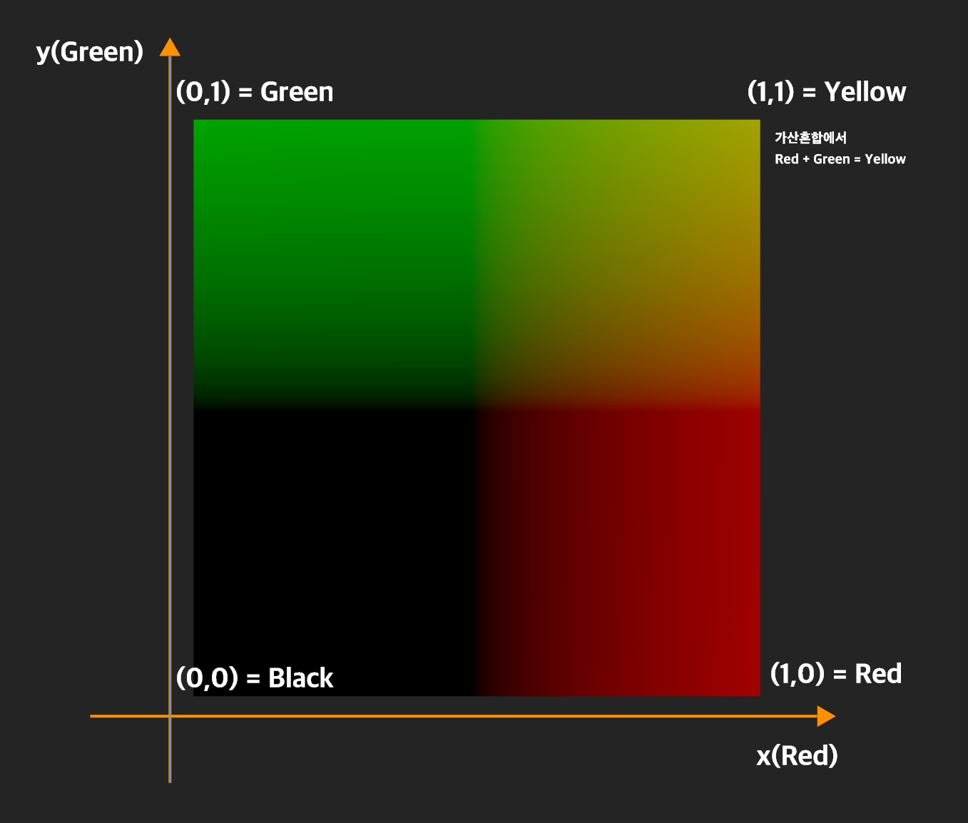 Split으로 나눠놓은 X, Y 데이터들을 다시 Combine으로 결합해 보면, Red(X축 값)와 Green(Y축 값)이 가산혼합되면서 노란색이 보이게 됩니다. 이렇게 해서 Position 노드의 프리뷰가 빨강, 노랑, 녹색, 검정의 그라디언트로 보이게 되는 것입니다.