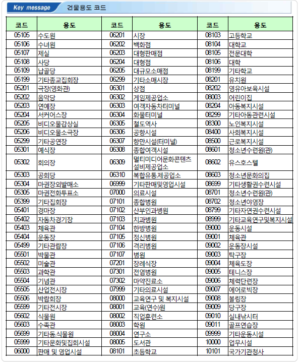 05203 연예장 06303 여객자동차터미널 08204 아동복지시설