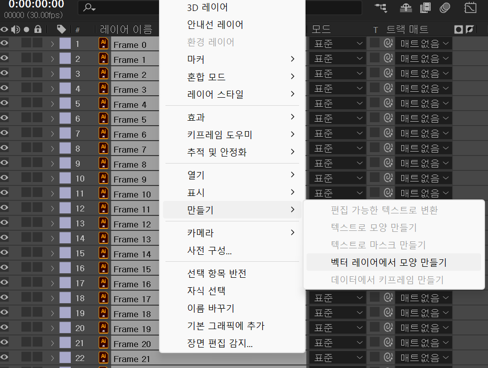 5. 일러스트레이터 파일을 애프터 이펙트로 불러옵니다. 파일 종류는 컴포지션으로, 푸티지 치수는 문서 크기로 설정해서 불러오면, 파일 이름으로 컴포지션이 생성됩니다. 컴포지션을 열어 각 레이어들 '시퀀스 레이어' 기능으로 1 프레임씩 배치합니다.