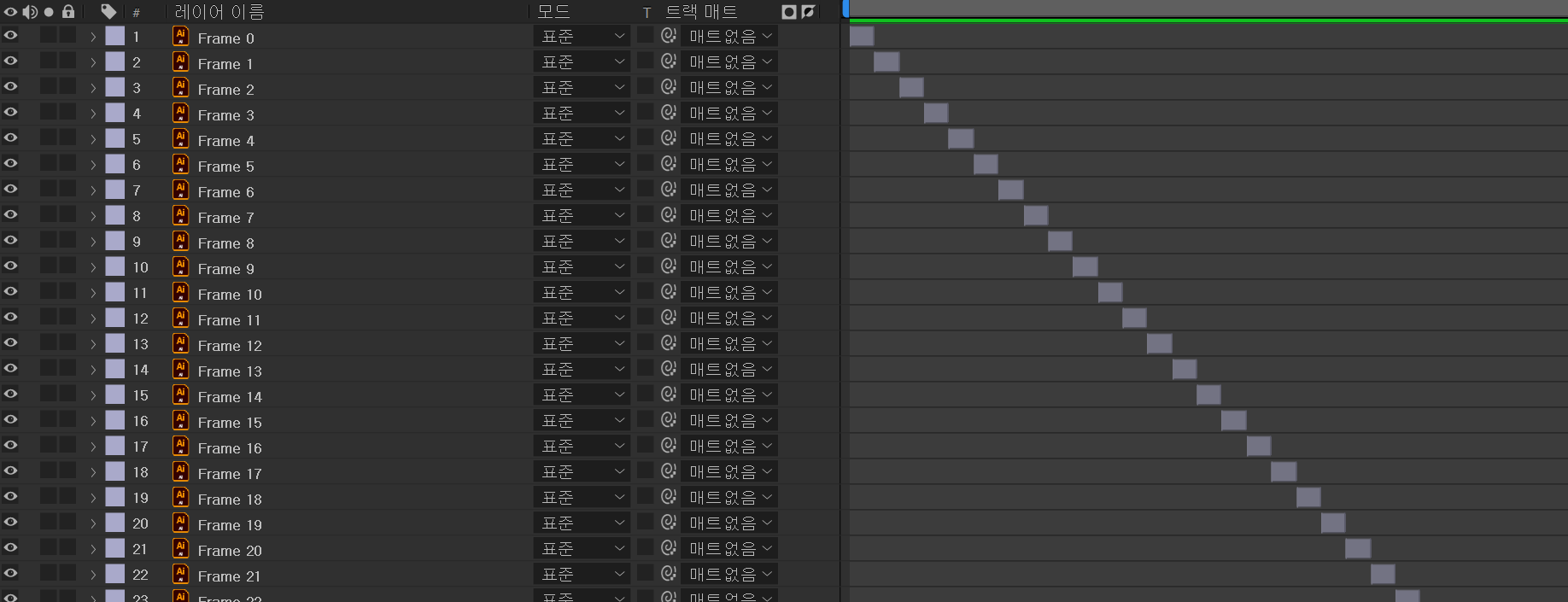 보통 애프터 이펙트에서는 한 애니메이션 덩어리를 위해 한 가지 소스를 이용합니다. 소스에 키 프레임을 찍으면 키프레임 사이는 프로그램이 자동으로 보간해 주며, 그래프의 핸들을 조정해 애니메이션을 완성하게 됩니다. 하지만 위의 방식은 매 프레임마다 보일 소스를 완성해 지정해 주는 방식이 됩니다.