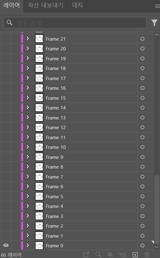 4. 내보내기 한 ai 파일을 열어보면 각 프레임의 아웃라인이 레이어로 변환되어 있습니다. 복잡한 모델링일수록 패스로 변환하면서 깨지거나 끊어진 부분이 많이 생깁니다. 일러스트레이터에서 레이어를 체크하며 다듬어줍니다. 저는 확인하면서 부드럽게 툴로 이어지는 패스들을 부드럽게 수정했습니다.