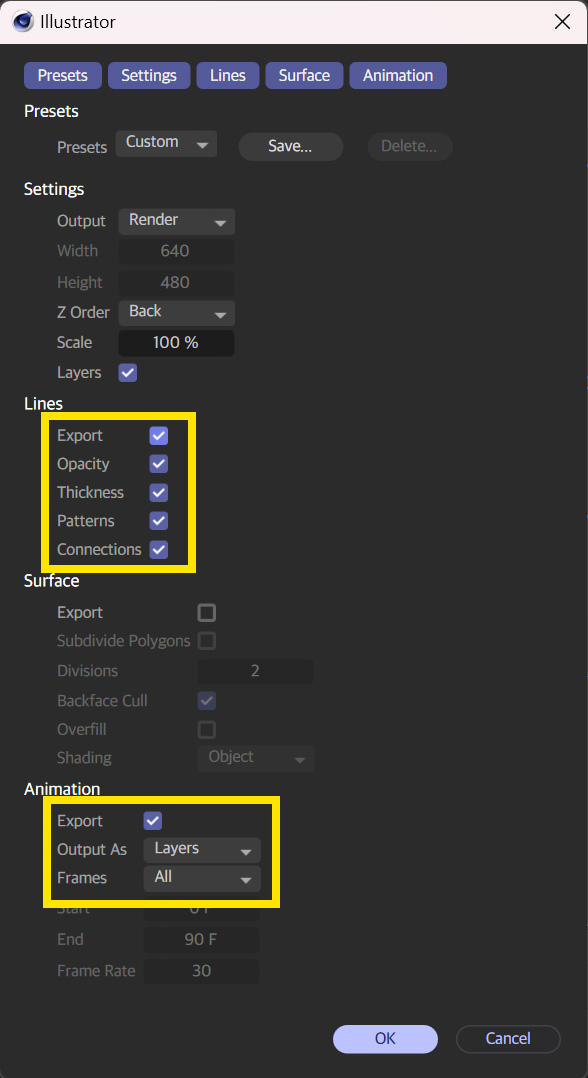 3. File - Export - Illustrator의 세팅 창을 엽니다. Lines, Animation의 Export를 체크해 줍니다. Animation의 Output as 옵션은 Layers로 세팅합니다. 세팅이 완료되면 OK를 눌러 내보내기를 진행합니다.