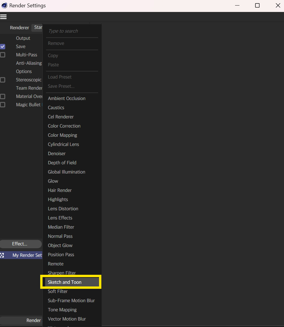 2. 렌더 세팅에서 Effect - Sketch and Toon을 추가해 줍니다. 그런 다음 하위 항목에서 필요한 부분을 체크합니다. 이번에는 Outline만 체크해 보겠습니다. 3D 모델링의 각 요소들(램프, 뚜껑, 구슬)을 분리해서 컬러를 다르게 하고 싶다면 Outline Culling을 self 말고 hierarchy로 바꿔줍니다.